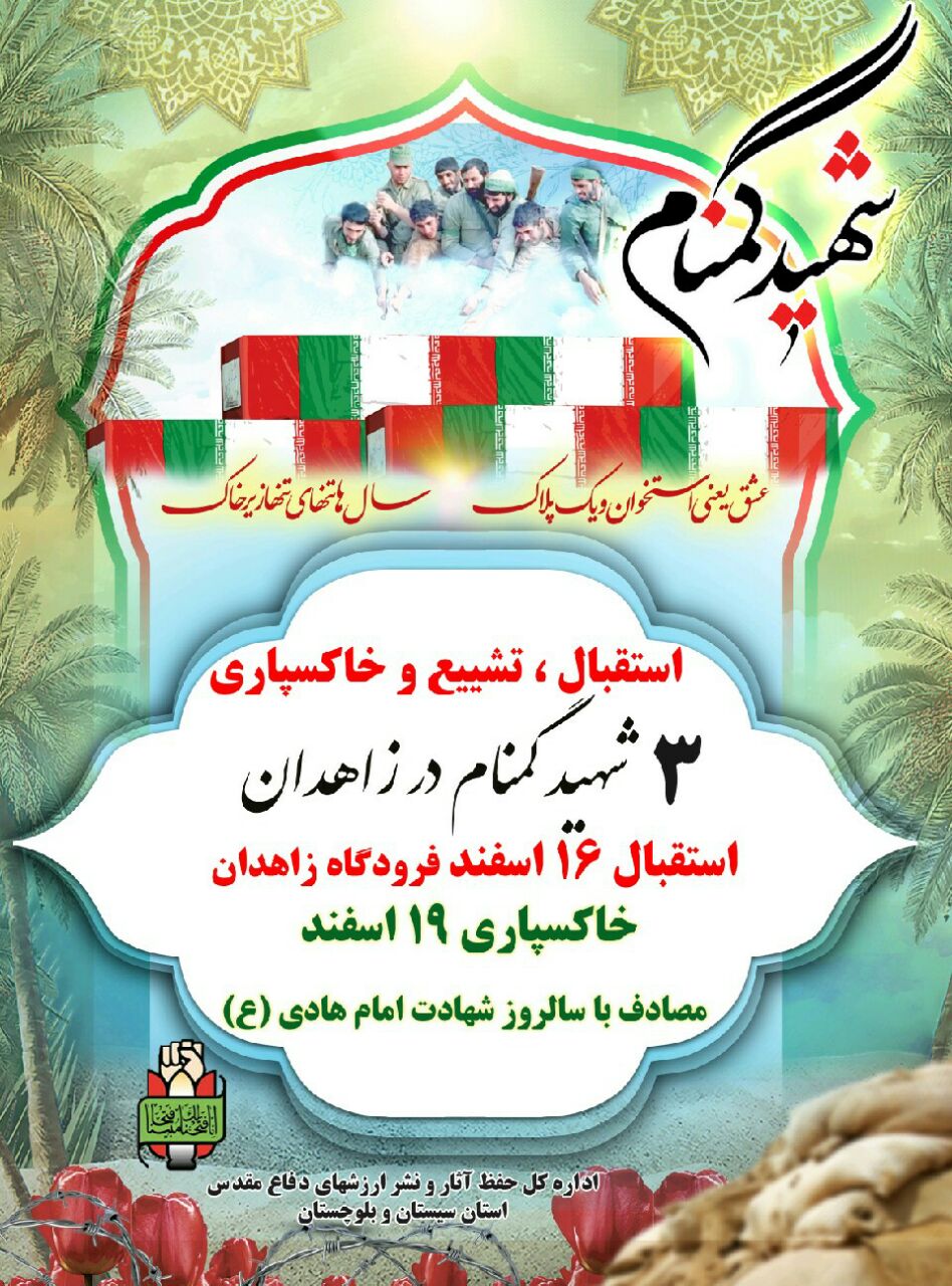 مراسم استقبال از 3 شهید گمنام زاهدان پنجشنبه 16 اسفند ساعت 8:30 صبح از فرودگاه زاهدان برگزار میشود.